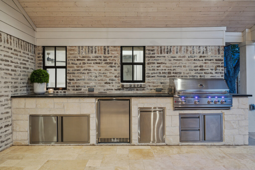 The outdoor kitchen was constructed along the house wall enabling us to use the brick as a backsplash. The fascia of the kitchen is stone from Rock Materials that matches the fireplace. We installed Black Mist granite from Daltile and the appliances are all RCS brand from Cunningham Living.