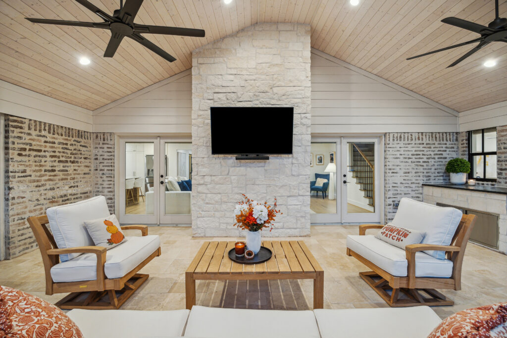 A vaulted ceiling really opened up the space. It is finished in a pre-stained tongue and groove by Fineline Realsoffit in Irish Cream. The trusses and columns are finished out with hardie plank and painted to match the home. The TV wall with the stone was already in place.